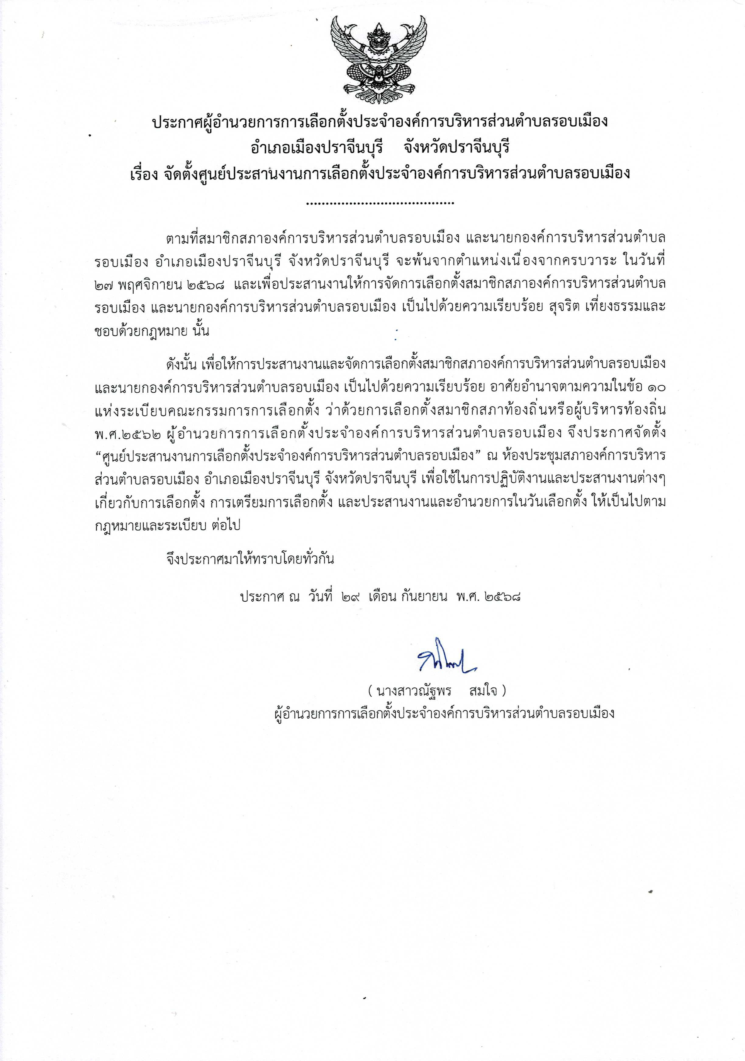 ประกาศจัดตั้งศูนย์ประสานงานการเลือกตั้งประจำ อบต.รอบเมือง